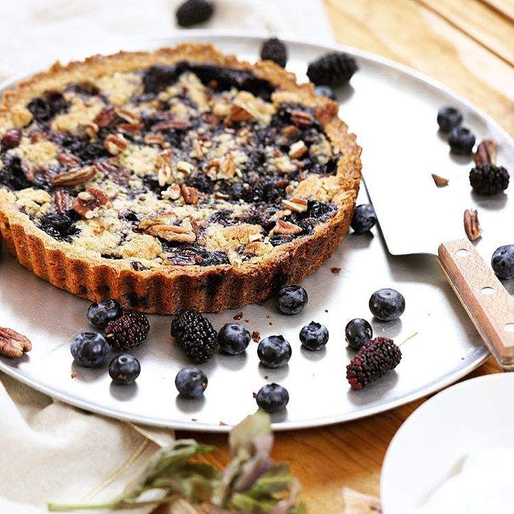 Preheat oven to 175C and lightly grease a 9-inch tart pan with removable bottom. Mix together in a bowl the blueberries, honey/maple syrup and tapioca starch/flour until well coated, this is your filling. Set aside. Add the almond meal, oats/teff, honey/maple, baking powder, and salt to a different bowl and mix until well combined. Add the coconut oil and use your fingers to work it in until coarse crumbs form and the mixture holds together when pressed. Remove a 1/2 cup of the crumbs for the topping and pour the remaining crumbs into the prepared tart pan. Press the dough evenly into the pan. Pour the blueberry mixture over the crust base. Add the chopped pecans to the remaining crumble mix and sprinkle evenly over the top of the berries. Bake for 40-45 minutes or until the filling is bubbling and the crust is lightly brown – 20 minutes into cooking time, check it and cover with foil to stop burning. Let cool completely before serving. Store leftovers in the fridge. It gets better with time too, making it a brilliant recipe to make in advance if you have friends coming over the next day.